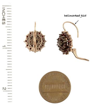 Bohemian garnet round earrings. Each earring is set with 21 original Bohemian garnets inch in a fine burgundy darkred color. One earring is 0.8 inch high and 0.55 inch wide. They were made in Sterling Silver (925) with a rosegoldplating like it was usual in the old days. The weight of one earring is 2.4 gram. The dimensions of the earrings can be seen on the last picture where I added an inch ruler and a coin to compare with. Shipment worldwide registered/insured is free. We ship worldwide - not listed countries on demand. Your jewel comes decorated in a beautiful jewel box. Please keep in mind that earrings are TWO pieces with double quantity of stones compared to a ring or pendant. All garnets are original Bohemian.