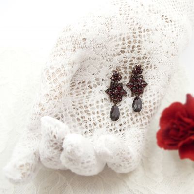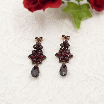 Vintage garnet star earrings. Each earring is set with 10 rosecut garnets and one oval briolet garnet measuring 0.4 x 0.2 inch in a fine burgundy darkred color. One earring is 1.32 inch high and 0.55 inch wide. They were made in Sterling Silver (925) with a rosegoldplating like it was usual in the old days. The weight of one earring is 3.2 gram. The dimensions of the earrings can be seen on the last picture where I added an inch ruler and a coin to compare with. Shipment worldwide registered/insured is free. We ship worldwide - not listed countries on demand. Your jewel comes decorated in a beautiful jewel box. Please keep in mind that earrings are TWO pieces with double quantity of stones compared to a ring or pendant.