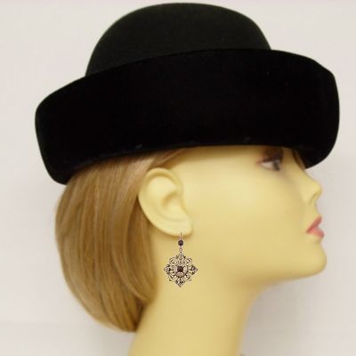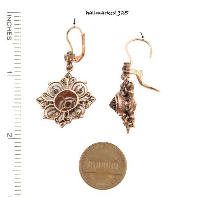 Vintage garnet earrings. Each earring is set with 2 rosecut garnets in a fine burgundy darkred color. One earring is 1.7 inch high and 0.95 inch wide. They were made in Sterling Silver (925) with a rosegoldplating like it was usual in the old days. The weight of one earring is 3.8 gram. The dimensions of the earrings can be seen on the last picture where I added an inch ruler and a coin to compare with. Shipment worldwide registered/insured is free. We ship worldwide - not listed countries on demand. Your jewel comes decorated in a beautiful jewel box. Please keep in mind that earrings are TWO pieces with double quantity of stones compared to a ring or pendant.