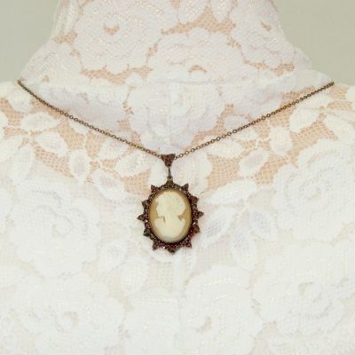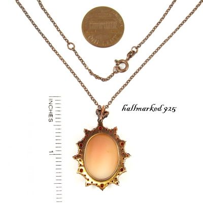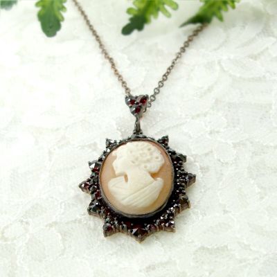 This necklace is set with 39 original Bohemian garnets surrounding a center oval shell cameo measuring 0.8 x 0.6 inch in a fine burgundy darkred color. The necklace\'s center is 1.5 inch high and 1.0 inch wide.The garnets are set in Sterling Silver 925 with a rosegoldplating like it was usual in the old days. The length of the necklace is 17.0 inch and could be adjusted to every length you tell us (for free)The chain is closed in the neck with a springring.The weight of this necklace is 8.3 gram. The size of the necklace can be seen on the last picture where I added an inch ruler and a coin to compare with. Your jewel comes decorated in a beautiful jewel box._All garnets are original Bohemian.