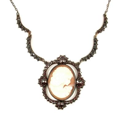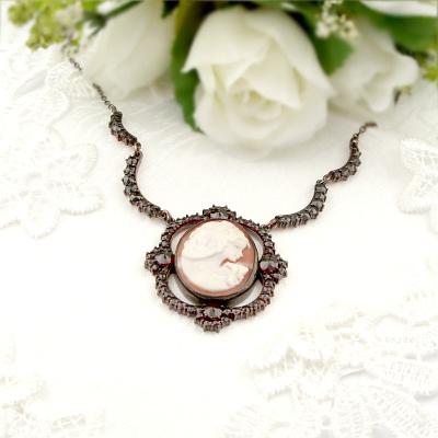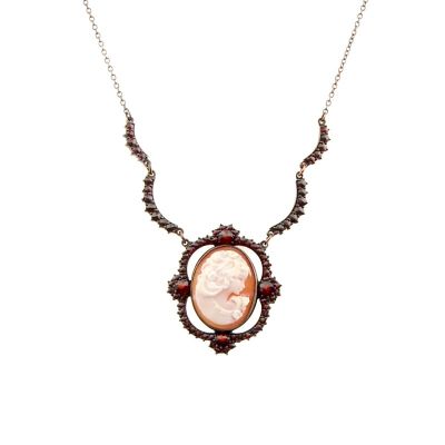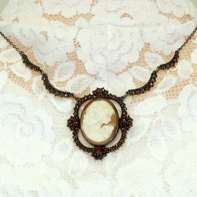 This necklace is set with 80 original Bohemian garnets surrounding a center oval shell cameo measuring 1.0 x 0.8 inch in a fine burgundy darkred color. The necklace\'s center is 3.0 inch high and 3.0 inch wide.The garnets are set in Sterling Silver 925 with a rosegoldplating like it was usual in the old days. The length of the necklace is 17.5 inch and could be adjusted to every length you tell us (for free)The chain is closed in the neck with a springring.The weight of this necklace is 14.2 gram. The size of the necklace can be seen on the last picture where I added an inch ruler and a coin to compare with. Your jewel comes decorated in a beautiful jewel box._All garnets are original Bohemian.