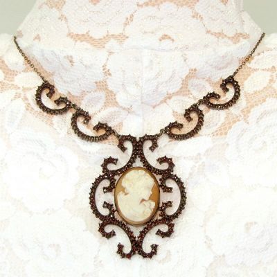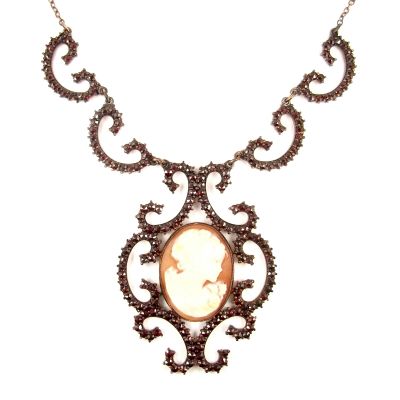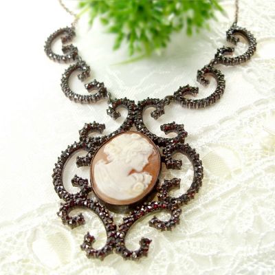 This necklace is set with 220 original Bohemian garnets surrounding a center oval shell cameo measuring 1.0 x 0.8 inch in a fine burgundy darkred color. The necklace\'s center is 3.0 inch high and 4.0 inch wide.The garnets are set in Sterling Silver 925 with a rosegoldplating like it was usual in the old days. The length of the necklace is 17.5 inch and could be adjusted to every length you tell us (for free)The chain is closed in the neck with a springring.The weight of this necklace is 21.9 gram. The size of the necklace can be seen on the last picture where I added an inch ruler and a coin to compare with. Your jewel comes decorated in a beautiful jewel box._All garnets are original Bohemian.