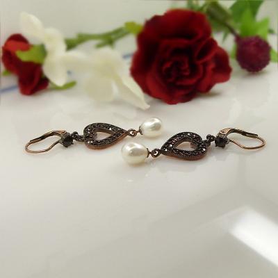 Each earring is set with 17 original Bohemian garnetsin a fine burgundy darkred color. One earring is 1.8 inch high and 0.6 inch wideholding a freshwater pearl 0.34 x 0.27 inch. The weight of one earring is 2.5 gramThey were made in Sterling Silver (925) with a rosegoldplating like it was usual in the old days. The size of the earrings can be seen on the last picture.where I added an inch ruler and a coin to compare with. Your jewel comes decorated in a beautiful black leatherette jewel box. Please keep in mind that earrings are TWO PIECES withDOUBLE QUANTITY OF STONES compared to a ring or pendant.All garnets are original Bohemian.