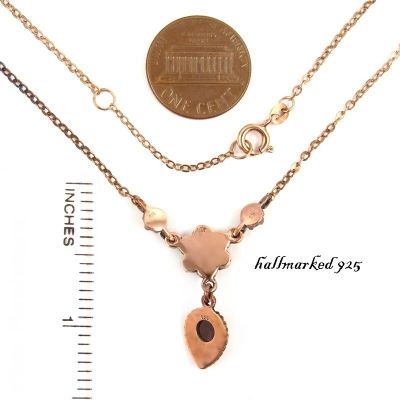 This necklace is set with 9 genuine natural rosecut garnets surrounding a center pearshape natural garnet measuring 0.35 x 0.25 inch in a fine burgundy darkred color. The garnet set center measures 1.14 inch height and 0.78 width.It is made in Sterling Silver (925) with a rosegoldplating. The length of the necklace is 18.0 inch and could be adjusted to every length you tell us (for free)The chain is closed in the neck with a springring.The weight of this necklace is 4.5 gram. The size of the necklace can be seen on the last picture where I added an inch ruler and a coin to compare with. Your jewel comes decorated in a beautiful jewel box._ This is huge old stock from a retired garnet wholesaler where I found many old garnet pieces in a forgotten attic. These old garnet jewels were made after WW2.It is made in Sterling Silver (925) with a rosegoldwash like it was usual in those days. All stones are genuine natural garnets.
