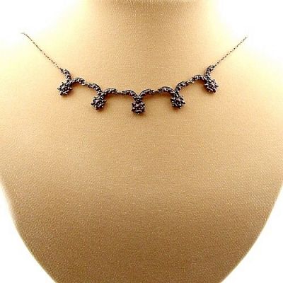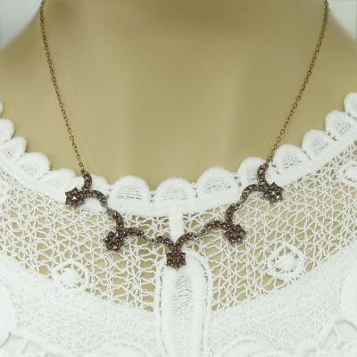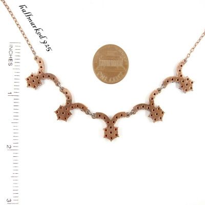 This necklace is set with 65 original Bohemian garnetsin a fine burgundy darkred color. The necklace\'s center is 1.6 inch high and 2.9 inch wide .The garnets are set in Sterling Silver 925 with a rosegoldplating like it was usual in the old days. The length of the necklace is 17.5 inch and could be adjusted to every length you tell us (for free)The chain is closed in the neck with a springring.The weight of this necklace is 7.8 grams. The size of the necklace can be seen on the last picture where I added an inch ruler and a coin to compare with. Your jewel comes decorated in a beautiful leatherette jewel box.