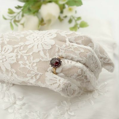 Cute oval Bohemian garnet ring with yellowgoldplating. This ring is set with 12 original Bohemian garnets surrounding a center oval garnet measuring 0.31 x 0.23 inch.in a fine burgundy darkred color. The ring\'s head is 0.52 inch high and 0.46 inch wide. This ring was made in Silver hallmarked 900 (old Bohemian alloy) with a yellowgoldplating like it was usual in the old days.I have three pieces of this ring in different sizes.One has an US-size 8 1/2 and the others have US-size 6.***Please tell me when you order this ring which size do you want to have***Its weight is 4.1 gram. The size of this ring can be seen on the last picture where I added an inch ruler and a coin to compare with. Your jewel comes decorated in a beautiful jewel box.All garnets are original Bohemian.