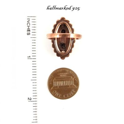 This ring is set with 18 genuine rosecut garnets surrounding a center marquise garnet measuring 0.75 x 0.37 inch.in a fine burgundy darkred color. The ring\'s head measures 0.97 inch by 0.56 width.The ring shank is Sterling Silver hallmarked 925and the rings head/stone mounting is also made inSterling Silver (925) with a rosegoldplating.This ring has an US-size 7 1/2 and its weight is 5.1 grams. The dimension of the ring can be seen on the last picture where I added an inch ruler and a coin to compare with. Your jewel comes decorated in a beautiful jewel box._The garnets are set in Sterling Silver (925) with a rosegoldwash like it was usual in these days. All stones are genuine natural garnets.??The larger stones sometimes may have small natural inclusionsthat can be seen with a loupe if you hold it against the lightbut not withthe naked eye or when you wear it. See pictures.