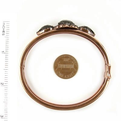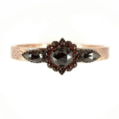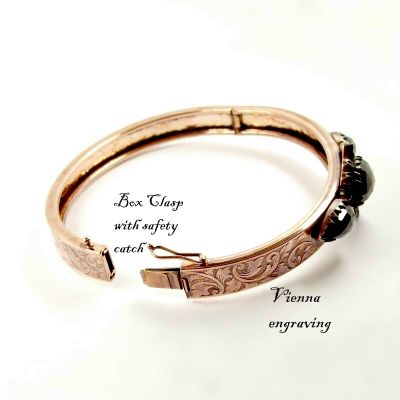 Vintage garnet bangle with an oval center stoneThis bangle is set with 35 genuine facetted rosecut garnets surrounding an oval center stone measuring 0.48 x 0.4 inch. The size of center medal is 0.7 inch high and 1.7 inch wide (see picture).It is set in the old alloy \'Tombak\' with a rosegoldplating like it was usually made in these days. The bangle is made of two halves that can be openedand closed with a failsafe box claspThe bangle measures 2.5 inch x 2.2 inch.(This would be similar to a bracelet of 7 1/4 inchesi.e. a normal wrist diameter for a lady )The weight is 19.0 grams.The size of the bangle can be seen on the last picture where I added an inch ruler and a coin to compare with. Your jewel comes decorated in a beautiful jewel box._ This is huge old stock from a retired garnet wholesaler where I found many old garnet pieces in a forgotten attic. These old garnet jewels were made after WW2. The garnets are set in \'Tombak\' also called \'garnet gold\' (similar to \'Pinchbeck\') a base metal withrosegoldplating like it was usual in those days. All stones are genuine natural garnets.The larger stones sometimes may have small natural inclusionsthat can be seen with a loupe if you hold it against the lightbut not withthe naked eye or when you wear it. See pictures.