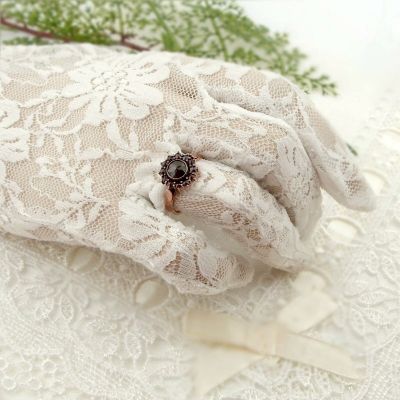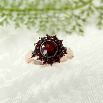 Cute round Bohemian garnet ringThis ring is set with 12 original Bohemian garnets surrounding a center round garnet measuring 0.25 inch in a fine burgundy darkred color. The ring\'s head is 0.46 inch high and 0.46 inch wide. This ring was made in Sterling Silver (925) with a rosegoldplating like it was usual in the old days. This ring has an US-size 7 and the weight is 3.1 grams. The size of this ring can be seen on the last picture where I added an inch ruler and a coin to compare with. Your jewel comes decorated in a beautiful jewel box.All garnets are original Bohemian.
