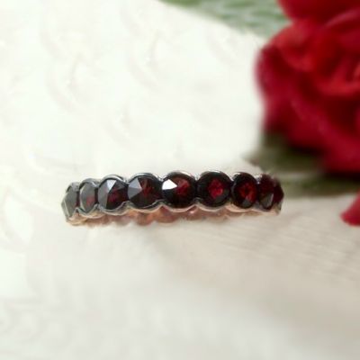 Bohemian garnet eternity ringThis ring is set all around with genuine Bohemian garnetswith a stone diameter of 3 mm each .This kind of eternity rings are often worn togetherwith a wedding band ring or as a friendship ring.The ring shank is Sterling Silver hallmarked 925 with a rosegoldplating. This ring has a thickness of 0.14 inch and it has US-size 7 3/4. It´s weight is 2.2 grams.The garnets are set in Sterling Silver (925) with a rosegoldwash like it was usual in these days. All stones are genuine natural Bohemian garnets.