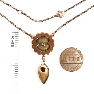 This necklace is set with 25 rosecut genuine natural garnets surrounding a center pearshape garnet measuring 0.6 x 0.35 inch in a fine burgundy darkred color. The size of the necklace\'s center is 1.6 inch high and 0.7 inch wide.It was made in the old alloy \'Tombak\' with a rosegoldplating like it was usual in those days. The length of the necklace is 17.5 inch and could be adjusted to every length you tell us (for free)The chain is closed in the neck with a springring.The weight of this necklace is 8.0 gram. The size of the necklace can be seen on the last picture where I added an inch ruler and a coin to compare with._ This is huge old stock from a retired garnet wholesaler where I found many old garnet pieces in a forgotten attic. These old garnet jewels were made after WW2. The garnets are set in \'Tombak\' also called \'garnet gold\' (similar to \'Pinchbeck\') a base metal with a rosegoldwash like it was usual in those days. All stones are genuine natural garnets.Your necklace comes decorated in a beautiful jewel box.??The larger stones sometimes may have small natural inclusionsthat can be seen with a loupe if you hold it against the lightbut not withthe naked eye or when you wear it. See pictures.
