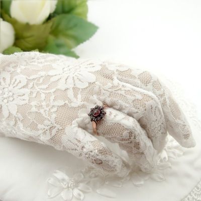 Cute Bohemian garnet ring with a rhodolite garnet center This ring is set with 8 original Bohemian garnets surrounding a center round rhodolite garnet of 0.17 inch in a fine rosecolor. The ring\'s head is 0.44 inch high and 0.44 inch wide.This ring was made in Sterling Silver (925) with a rosegoldplating like it was usual in the old days.This ring has an US-size 8 and the weight is 2.5 gram.The dimensions of this ring can be seen on the last picture where I added an inch ruler and a coin to compare with. shipment is free by registered letter insured Your jewel comes decorated in a beautiful jewel box._____________________________________________ ГРАНАТ is the Russian spelling for garnet. All garnets are original Bohemian.