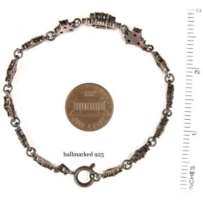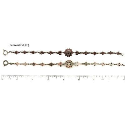 Original Bohemian garnet braceletThis bracelet is set with 65 original Bohemian garnetsin Sterling Silver (925) goldplated with a rosegoldplating like it was usually made in the old days.65 round rosecut garnets are linked together to a bracelet of7 1/2 inch length and 0.6 inch width (round center medal).The weight of that bracelet is 9.3 gramsThe size of the bracelet can be seen on the last picture where I added an inch ruler and a coin to compare with.All stones are genuine natural Bohemian garnets.
