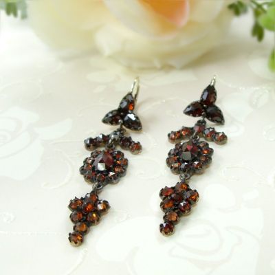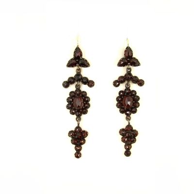 Each earring is set with genuine 27 facetted rosecut garnets surrounding a center oval garnet measuring 0.28 x 0.2 inch. The size of one earring is 2.3 inch high and 0.6 inch wide. They were made in the old alloy \'Tombak\' (similar to \'Pinchbeck\')with a rosegoldplating like it was usual in those days. The earwires are made of solid 14ct gold.The weight of one earring is 4.5 gram*If you want studs/posts instead of french wires*If you want french wires instead of studs/postslet me know - we can exchange it with no charge. The size of the earrings can be seen on the last picture where I added an inch ruler and a coin to compare with. This is huge old stock from a retired garnet wholesaler where I found many old garnet pieces in a forgotten attic. These old garnet jewels were made after WW2. The garnets are set in \'Tombak\' also called \'garnet gold\' (similar to \'Pinchbeck\') a base metal withrosegoldplating like it was usual in these days. All stones are genuine natural garnets.Your earrings come decorated in a beautiful jewel box or pouch.Please keep in mind that earrings are TWO pieces with double quantity of stones compared to a ring or pendant .The **larger stones sometimes may have small natural inclusionsthat can be seen with a loupe if you hold it against the lightbut not with the naked eye or when you wear it. See pictures.