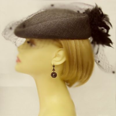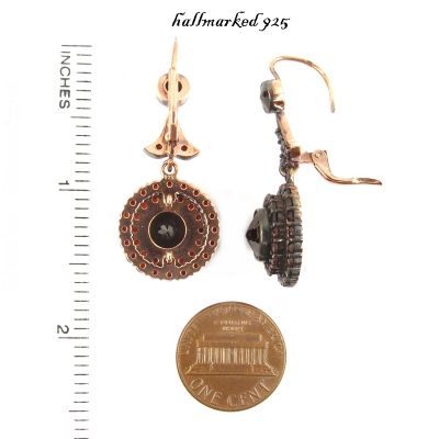 Bohemian garnet earrings Each earring is set with 42 original Bohemian garnets surrounding a center round stone measuring 0.35 x 0.35 inch in a fine burgundy darkred color. One earring is 1.6 inch high and 0.6 inch wide (see picture).They were made in Sterling Silver (925) with a rosegoldplating like it was usual in the old days. On top of each earring 5 garnets holda (drippy) pendant with 37 rosecut garnetsThe weight of one earring is 5.4 gram*If you want posts instead of french wires*If you want french wires instead of studs/postslet me know - we can exchange it with no charge. The size of the earrings can be seen on the last picture where I added an inch ruler and a coin to compare with. Your jewel comes decorated in a beautiful black leatherette jewel box. Please keep in mind that earrings are TWO PIECES withDOUBLE QUANTITY OF STONES compared to a ring or pendant.