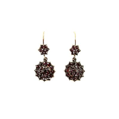 Each earring is set with 28 original Bohemian garnetsin a fine burgundy darkred color. One earring is 1.3 inch high and 0.5 inch wide. They were made in Sterling Silver (925) with a rosegoldplating like it was usual in the old days. On top of each earring 7 garnets holda round garnet cluster pendant with 21 rosecut garnetsThe weight of one earring is 2.9 grams. The size of the earrings can be seen on the last picture where I added an inch ruler and a coin to compare with. Your jewel comes decorated in a beautiful jewel box.