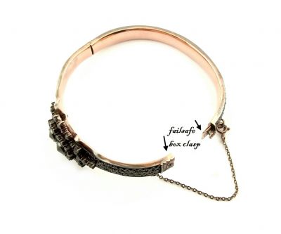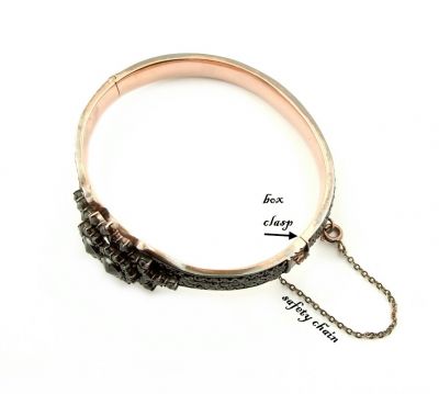 Impressive Bohemian garnet bangle in Victorian style This bangle is set with 248(!) genuine facetted rosecut garnets surrounding two center stones measuring 0.2 inch. The garnet set medal on top is 0.9 inch high and 1.4 inch wide. It is set in Sterling Silver with a rosegoldplating. The bangle is made of two halves that can be opened and closed with a failsafe box clasp and a safety chain. It is set allaround in 3 rows with Bohemian rosecut garnets.The bangle measures 2.5 inch x 2.3 inch. (This would be similar to a bracelet of 7 1/2 inches i.e. a normal wrist diameter for a lady ) The weight is 34 grams The dimensions of the bangle can be seen on the last picture where I added an inch ruler and a coin to compare with. shipment is free by registered letter insured We ship worldwide - not listed countries on demand Your jewel comes decorated in a beautiful jewel box. __________________________________________________ All garnets are original Bohemian. ГРАНАТ is the Russian spelling for garnet.