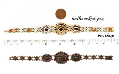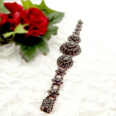 Impressive original Bohemian garnet braceletThis bracelet is set with 188 original Bohemian garnetsin a fine burgundy darkred color made inSterling Silver (925) goldplated with a rosegoldplating like it was usual in the old days.Twelve moveable garnet parts are linked togetherto a bracelet of 7.5 inch (length) and 0.9 inch (width).The weight of this bracelet is 24.6 gram