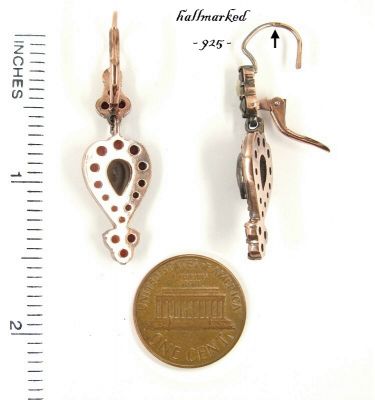 Bohemian garnet heart drop earrings Each earring is set with 19 original Bohemian garnets surrounding an pearshape facetted rosecut garnet in a fine burgundy darkred color measuring 0.3 x 0.2 inches. They were made in Sterling Silver (925) with a rosegoldplating like it was usual in the old days. Each earring measures allover 1.5 x 0.4 inches. The weight of one earring is 3 grams. If you want studs/posts instead of french wires let me know - we can exchange it with no charge. The size of the earrings can be seen on the last picture where I added an inch ruler and a coin to compare with. The garnets are set in Sterling Silver (925) with a rosegoldplating like it was usual in the old days. All stones are genuine natural Bohemian garnets. Please keep in mind that earrings are TWO pieces with double quantity of stones compared to a ring or pendant.