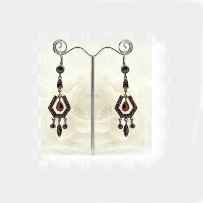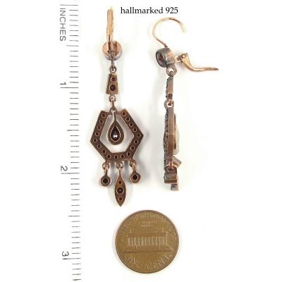 Interesting Bohemian garnet earrings in Art Deco style. Each earring is set with 26 original Bohemian garnets surrounding a center pearshape stone measuring 0.3 x 0.2 inch. One earring is 2.2 inch high and 0.6 inch wide (see picture).They were made in Sterling Silver (925) with a rosegoldplating like it was usual in the old days. On top of each earring a round garnets holda drippy pendant with 26 rosecut garnets .The earring earwires are made of solid 14ct gold.The weight of one earring is 4.7 grams. The size of the earrings can be seen on the last picture where I added an inch ruler and a coin to compare with.