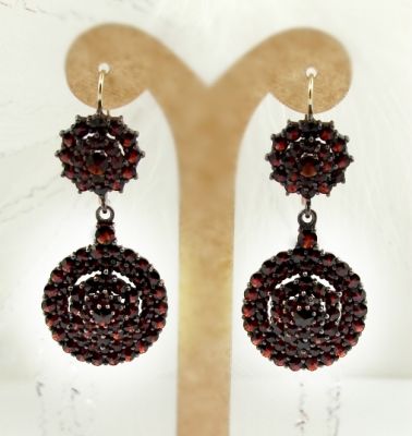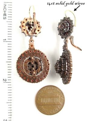 Each earring is set with 85 original Bohemian garnetsarranged in two round garnet clustersOne earring is 1.8 inch high and 0.8 inch wide. They were made in Sterling Silver (925) with a rosegoldplating like it was usual in the old days. On top of each earring 20 garnets hold asecond round garnet cluster with 65 rosecut garnetsThe earring earwires are made of solid 14ct gold.The weight of one earring is 6.9 gramIf you want posts instead of french wireslet me know - we can exchange it with no charge. The size of the earrings can be seen on the last picture where I added an inch ruler and a coin to compare with.