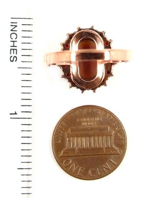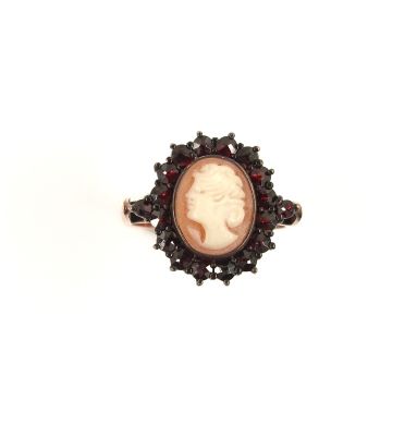 Bohemian garnet ringThis ring has an oval cameo (measuring 0.42 ” x 0.34 ”)surrounded by 18 Bohemian rosecut garnets.* in a fine burgundy darkred colorThe ring\'s head is 0.63 inch high and 0.73 inch wide (see picture).This ring is made in Sterling Silver (925) with a rosegoldplating like it was usual in the old days.If you\'d prefer a yellow gold plating let me know.We could change it to yellow gold color electroplating itwithin one week with an 18ct gold overlay in our workshop.(R2)The ring head measures 0.63 × 0.73 inchThis ring has an US-size 7 1/2 and the weight is 3.9 gram.(R3)The size of this ring can be seen on the last picture where I added an inch ruler and a coin to compare with. The garnets are set in Sterling Silver (925) with a rosegoldwash like it was usually made in these days. The ring shank is Sterling Silver (925). All stones are genuine natural Bohemian garnets.