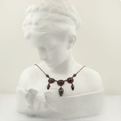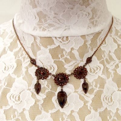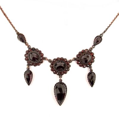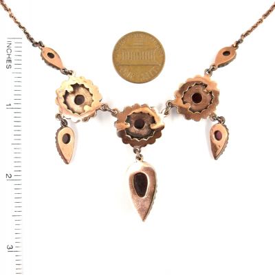 This necklace is set with genuine 50 facetted rosecut garnets surrounding a center oval stone measuring 0.36 x 0.26 inch. The size of the necklace\'s center is 3.0 inch high and 2.5 inch wide (see picture).It was made in the old alloy \'Tombak\' with a rosegoldplating like it was usual in those days. The length of the necklace is 17.5 inch and could be adjusted to every length you tell us (for free)The chain is closed in the neck with a springring / boxclasp ...The weight of this necklace is 18.4 gram. The size of the necklace can be seen on the last picture where I added an inch ruler and a coin to compare with. Your jewel is packed in a beautiful black leatherette jewel box._ This is huge old stock from a retired garnet wholesaler where I found many old garnet pieces in a forgotten attic. These old garnet jewels were made after WW2. The garnets are set in \'Tombak\' also called \'garnet gold\' (similar to \'Pinchbeck\') a base metal with a rosegoldwash like it was usual in those days. All stones are genuine natural garnets.??The larger stones sometimes may have small natural inclusionsthat can be seen with a loupe if you hold it against the lightbut not withthe naked eye or when you wear it. See pictures.