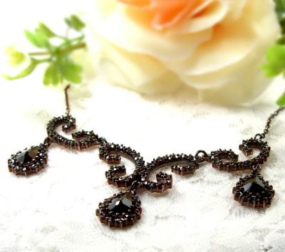 This impressive drippy necklace is set with 133 original Bohemian garnets surrounding three pearshaped garnets measuring 0.35 x 0.23 inch.in a fine burgundy darkred color. The necklace\'s center is 1.5 inch high and 3.0 inch wide.The garnets are set in Sterling Silver 925 with a rosegoldplating like it was usual in the old days. The length of the necklace is 17.5 inch and could be adjusted to every length you tell us (for free)The chain is closed in the neck with a springring.The weight of this necklace is 12 grams. The size of the necklace can be seen on the last picture where I added an inch ruler and a coin to compare with.