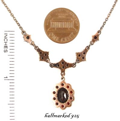 Bohemian garnet necklace with oval pendantThis necklace is set with 23 original Bohemian garnets surrounding a center oval stone measuring 0.33 x 0.26 inch.in a fine burgundy darkred color. The necklace\'s center is 2.0 inch high and 1.5 inch wide.The garnets are set in Sterling Silver 925 with a rosegoldplating like it was usual in the old days. The length of the necklace is 17 inch and could be adjusted to every length you tell us (for free)The chain is closed in the neck with a springring.The weight of this necklace is 5.5 gram.The size of the necklace can be seen on the last picture where I added an inch ruler and a coin to compare with.