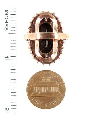 Awesome oval original Bohemian garnet ringThis ring has a big oval center garnet stonein a fine burgundy darkred color measuring 0.62 ” x 0.32 inchsurrounded by 48 Bohemian rosecut garnets.The ring\'s head is 1 inch high and 2/3 inch wide (see picture). This ring was made in Sterling Silver (925) with a rosegoldplating like it was usual in the old days.It has an US-size 7 1/2 and the weight is 7 grams.The size of this ring can be seen on the last picture where I added an inch ruler and a coin to compare with.