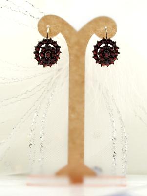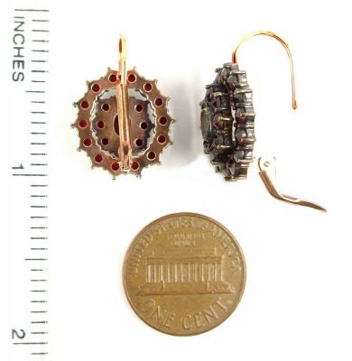Oval original Bohemian garnet earrings/boutonsw/14ct gold wiresEach earring is set with 2 layers of Bohemian garnets surrounding a center oval stone measuring 0.18 x 0.14 inch.in a fine burgundy darkred color.Each earring is 0.8 inch high and 0.6 inch wide (see pictures).They were made in Sterling Silver (925) with a rosegoldplating like it was usual in the old days. The earring\'s earwires are made of solid 14ct gold.The weight of one earring is 2.8 grams. The size of the earrings can be seen on the last picture where I added an inch ruler and a coin to compare with.