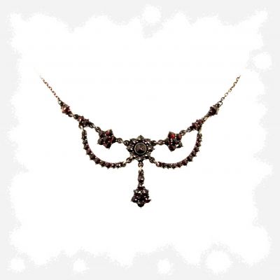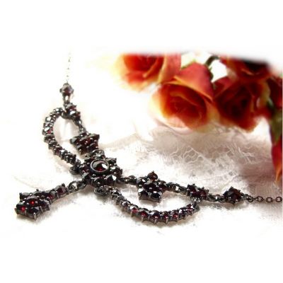 This necklace is set with 55 original Bohemian garnets surrounding an round facetted rosecutcenter garnet in a fine burgundy darkred color measuring 2.0 x 2.0 inch. The garnets are set in Sterling Silver 925 with a rosegoldplating like it was usual in these days. The length of the necklace is 10.0 inch and could be adjusted to every length you tell us (for free)The weight of this necklace is 9.8 gThe size of the necklace can be seen on the last picture where I added an inch ruler and a coin to compare with. The garnets are set in Sterling Silver (925) with a rosegoldwash like it was usual in the old days. All stones are genuine natural Bohemian garnets.