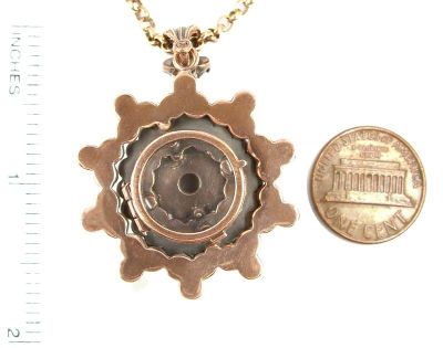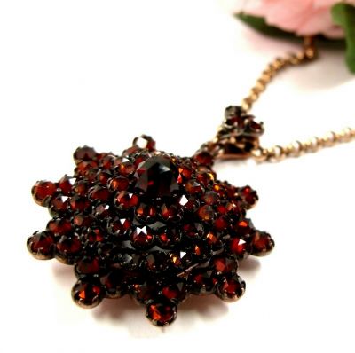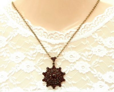 Vintage garnet star locket/pendant This pendant is set with 80 genuine facetted rosecut garnetsand has a safe locket on the reverse side (see pictures) It was made in the old alloy \'Tombak\' with a rosegoldplating like it was usual in those days. The length of the chain is 19 inch and could be adjusted to every length you tell us (for free) The weight of this pendant is 18.8 gram. The size of the pendant can be seen on the last picture where I added an inch ruler and a coin to compare with. *This is huge old stock from a retired garnet wholesaler where I found many old garnet pieces in a forgotten attic. These old garnet jewels were made after WW2. The garnets are set in \'Tombak\' also called \'garnet gold\' (similar to \'Pinchbeck\') a base metal with a rosegoldwash like it was usual in those days. All stones are genuine natural garnets.On the reverse side there is a locket with a small window to open where you canadd a picture, curled hair, pills etc...