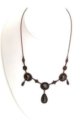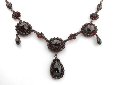 Big rosecut garnet necklace87 rosecut garnets in 9 different parts.3 parts have a big rosecut middle stone measures 0.47 inch x 0.40 inchFrom this parts dangle 3 drops the biggest measures 0.6 inch x 0.35 inch. The necklace has a size allover of 16.5 inch andThe weight of this necklace is 26.1 grams.This is old stock from a retired garnet wholesaler where I foundmany old garnet pieces in a forgotten attic. These old garnetjewels were made after WW2. All garnets are set in Silver 925 with a rosegoldwash like it was usually made in thesedays. All stones are genuine natural garnets.