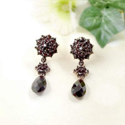 Bohemian garnet cascade earstuds with dangling briolets Each earring is set with 26 original Bohemian garnets and a facetted briolet drop measuring 0.42 x 0.28 inch in a fine burgundy darkred color. One earring is 1.4 inch high and 0.5 inch wide. They were made in Sterling Silver (925) with a rosegoldplating like it was usual in the old days. The weight of one earring is 3.6 gram The dimensions of the earrings can be seen on the last picture where I added an inch ruler and a coin to compare with. Shipment worldwide registered/insured is free. We ship worldwide - not listed countries on demand. Your jewel comes decorated in a beautiful jewel box. __________________________________________________ Please keep in mind that earrings are TWO pieces with double quantity of stones compared to a ring or pendant. All stones are genuine natural garnets. ГРАНАТ is the Russian spelling for garnet.